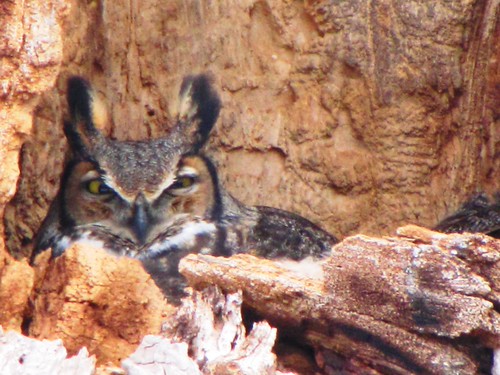 A few blogs back I showed you an image of a male Great-horned perched complacently on a branch (Iwanta be-aloneia). I theorized that his mate, and her nest, would be close by. Since that time the nest, and the female in question, have been located. Her chosen spot is a large cavity within the broken stub of a huge decrepit Cottonwood. This is the same place that the couple chose two winters ago (we don’t know where they nested last year). Although Great-horns don’t normally nest in the same place more than once, they will if no new alternatives present themselves.
