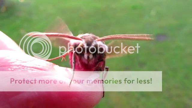 Taking it outside for a better look in the low evening sun, it began to vibrate its wings in preparation for takeoff. Moths need to raise their body temperatures up to near human levels in order for the thorax muscles to work and they do so by shivering. This one began with a staccato flutter of the wings (see movie here) which evolved over the course of a few minutes into a blurry all-body tremor (see second movie here).